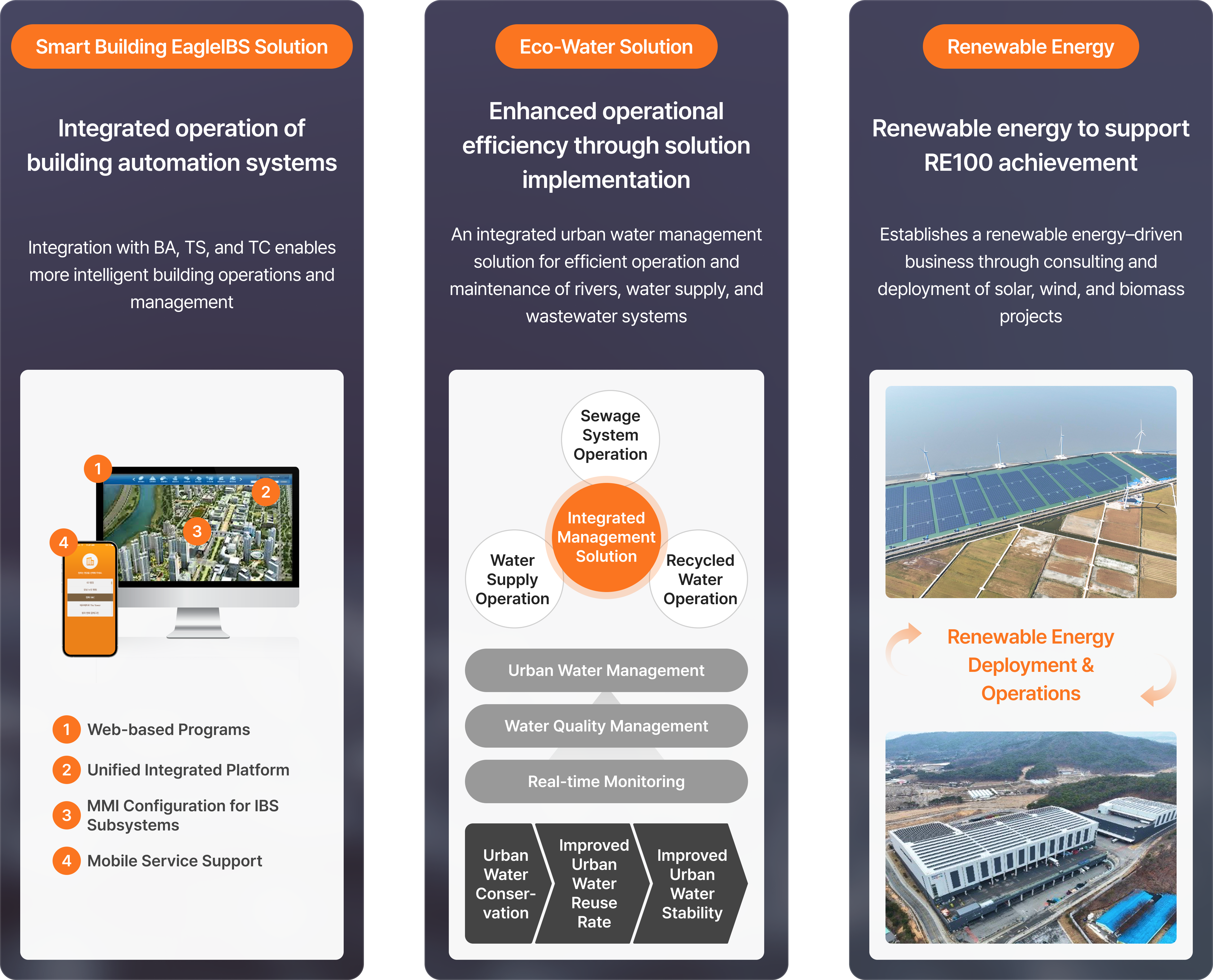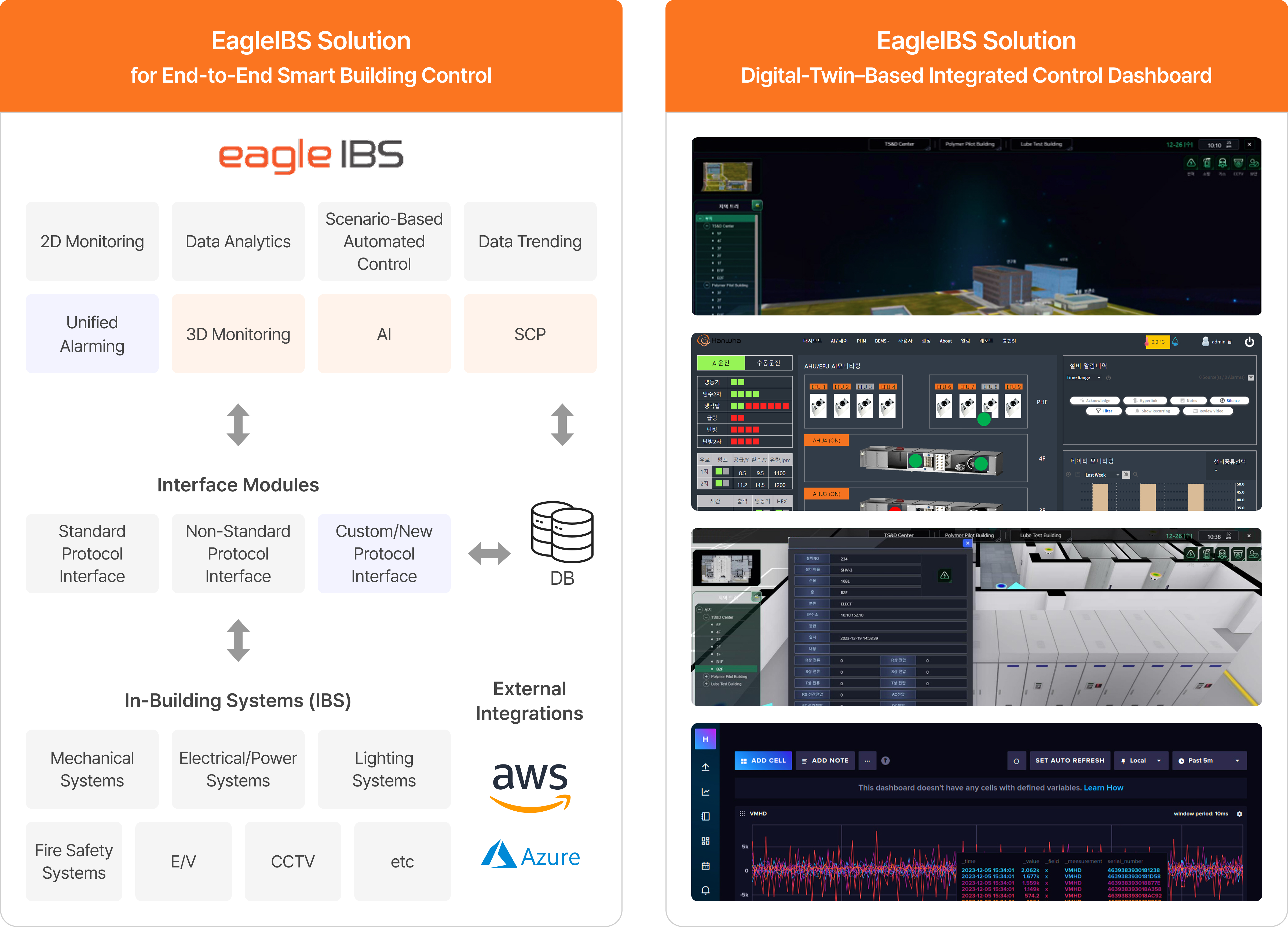 Hanwha Systems proprietary EagleIBS solution integrates standalone Building Automation (BA), Total Security (TS), and Telecom Infrastructure (TC) systems to significantly enhance smart building operational efficiency.
