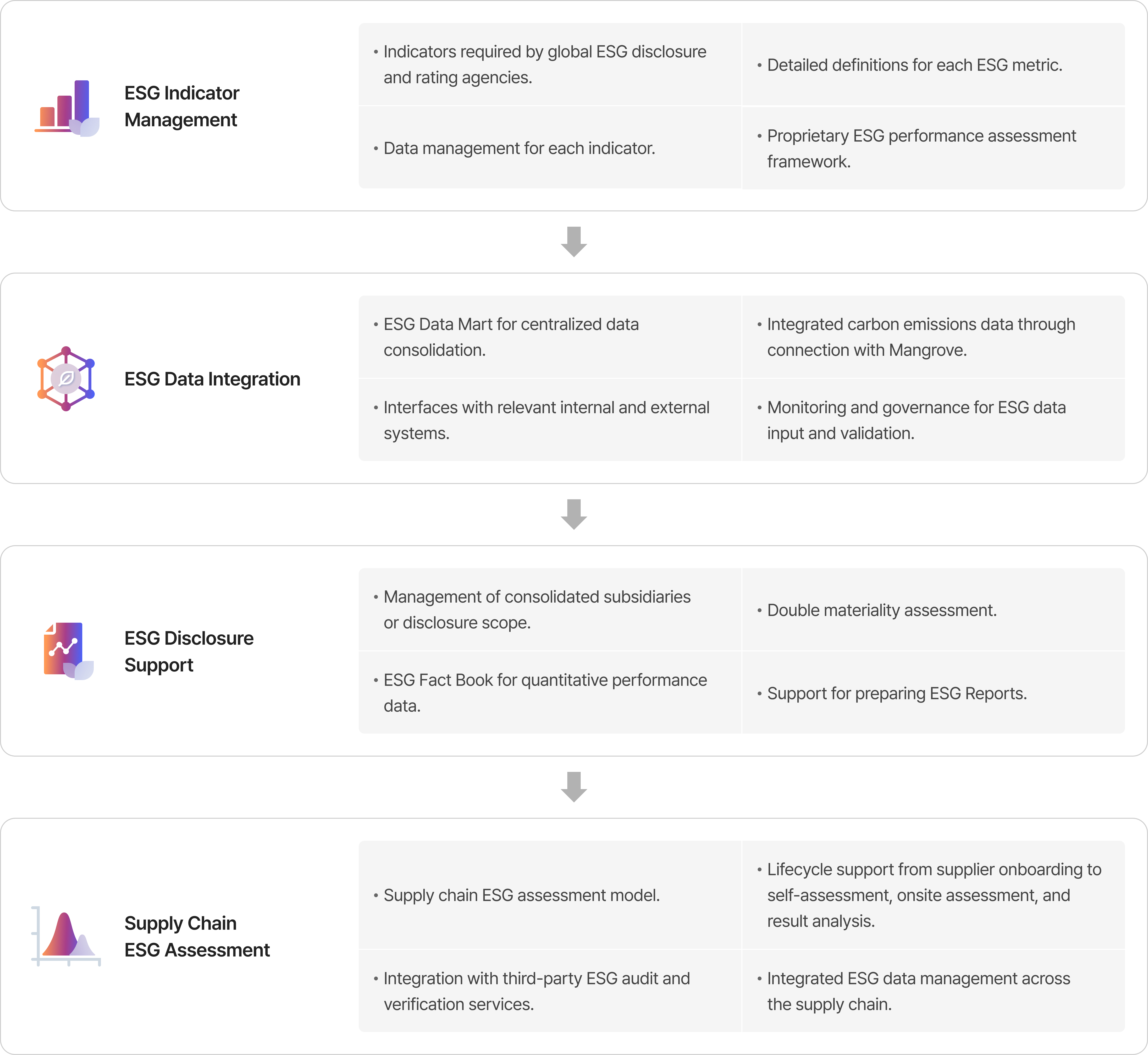 Supports overall ESG management functions including disclosure/compliance, risk management,
