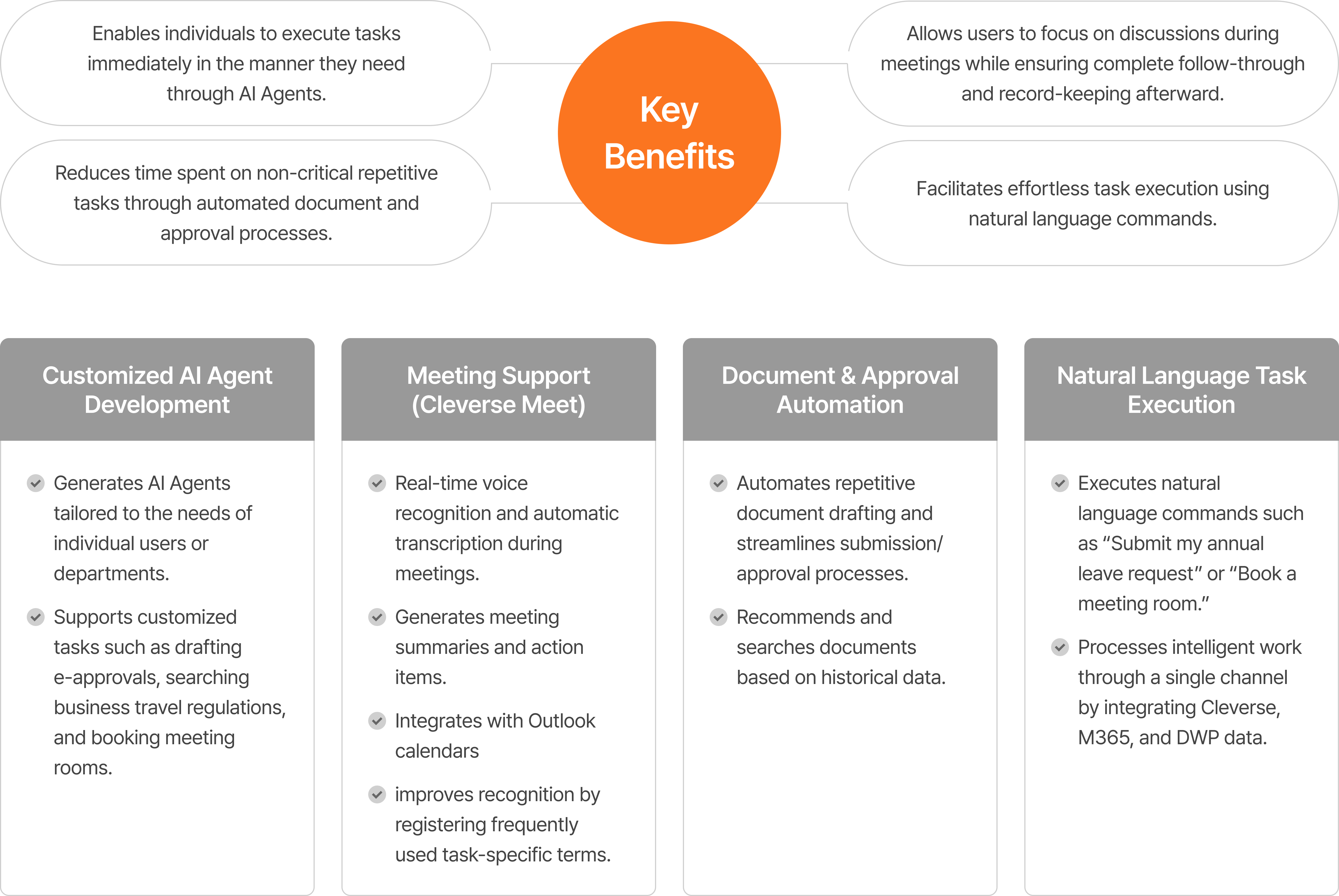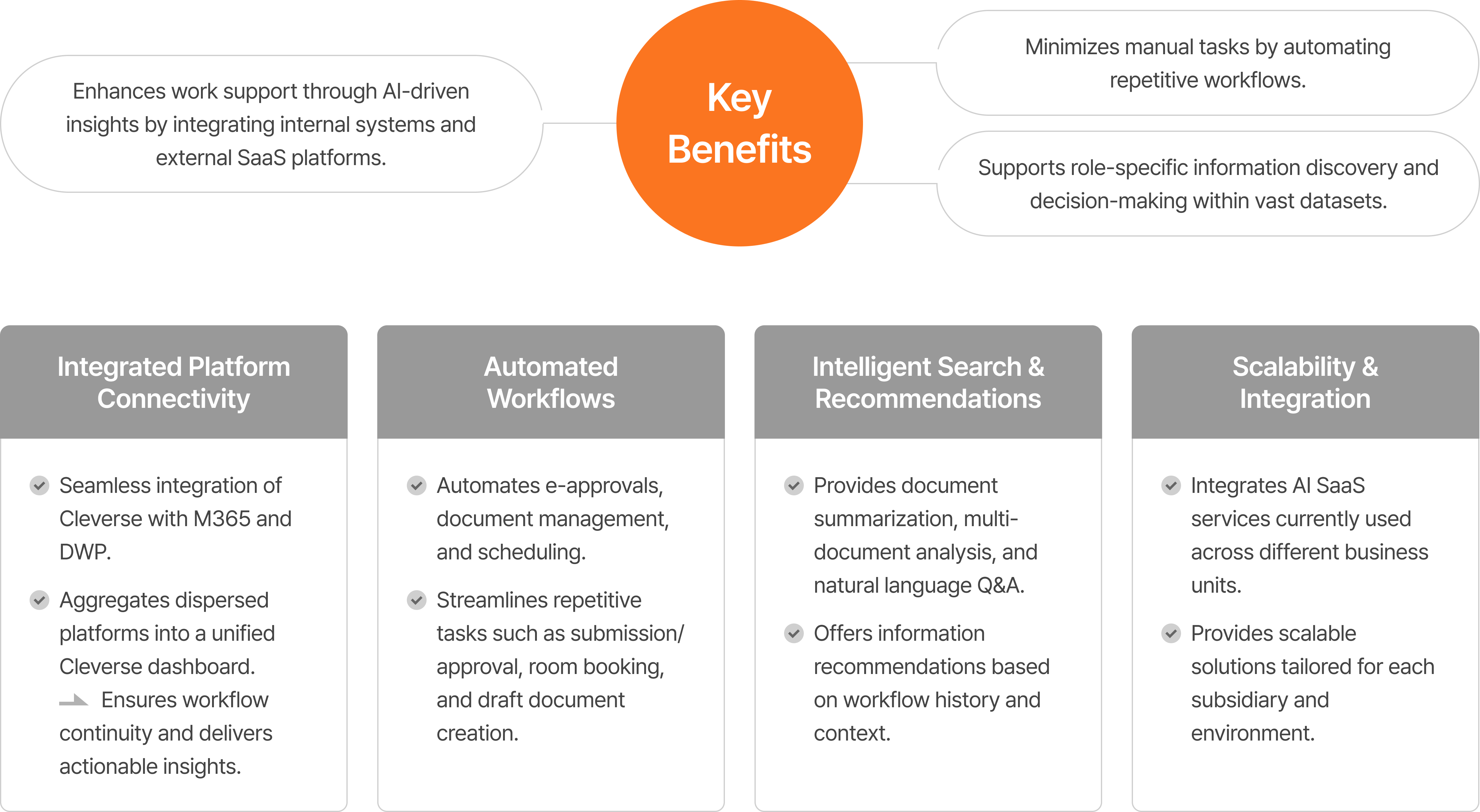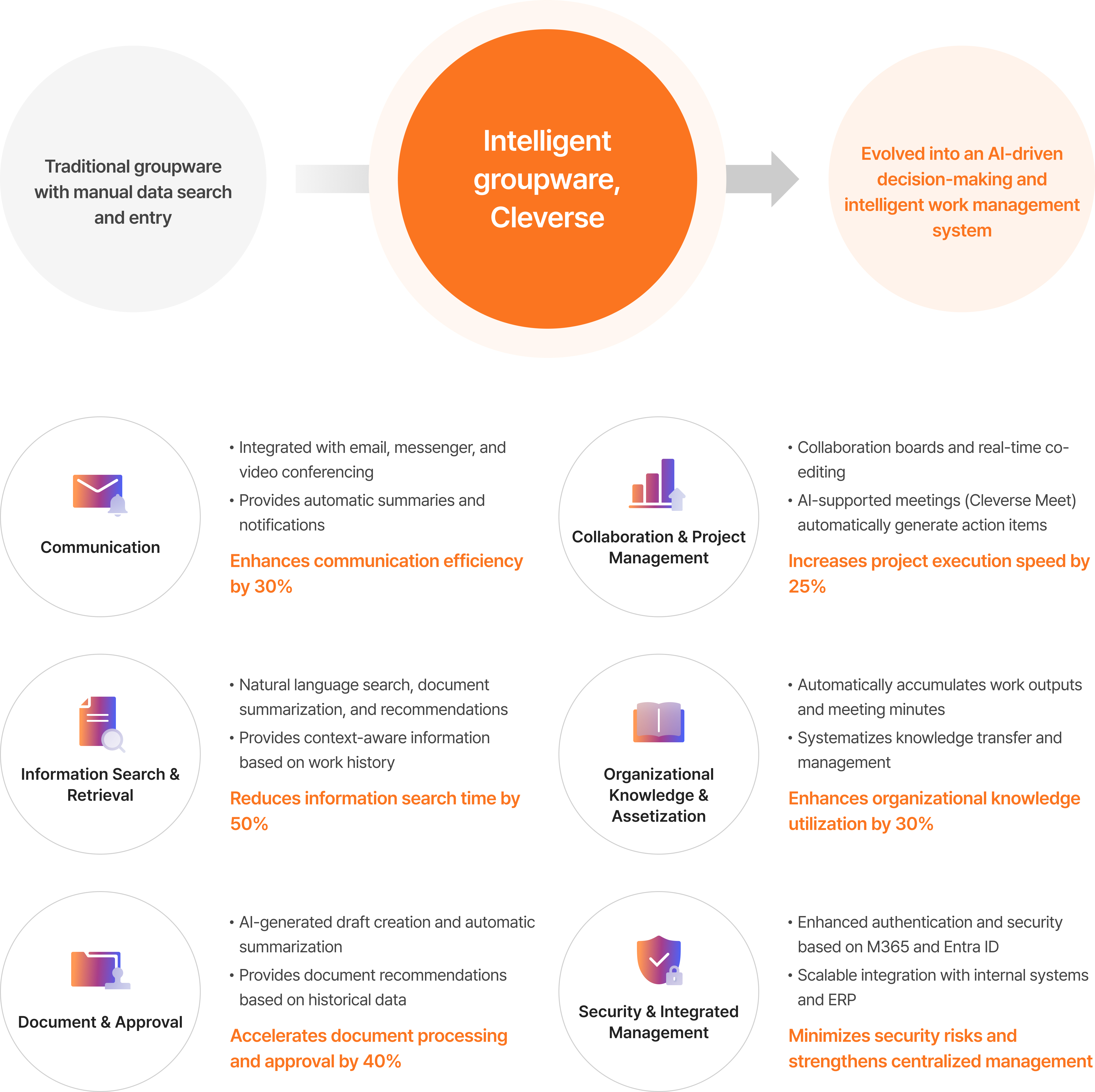 scheduling, e-approval, and bulletin boards—Cleverse utilizes AI to drive smart work innovation.