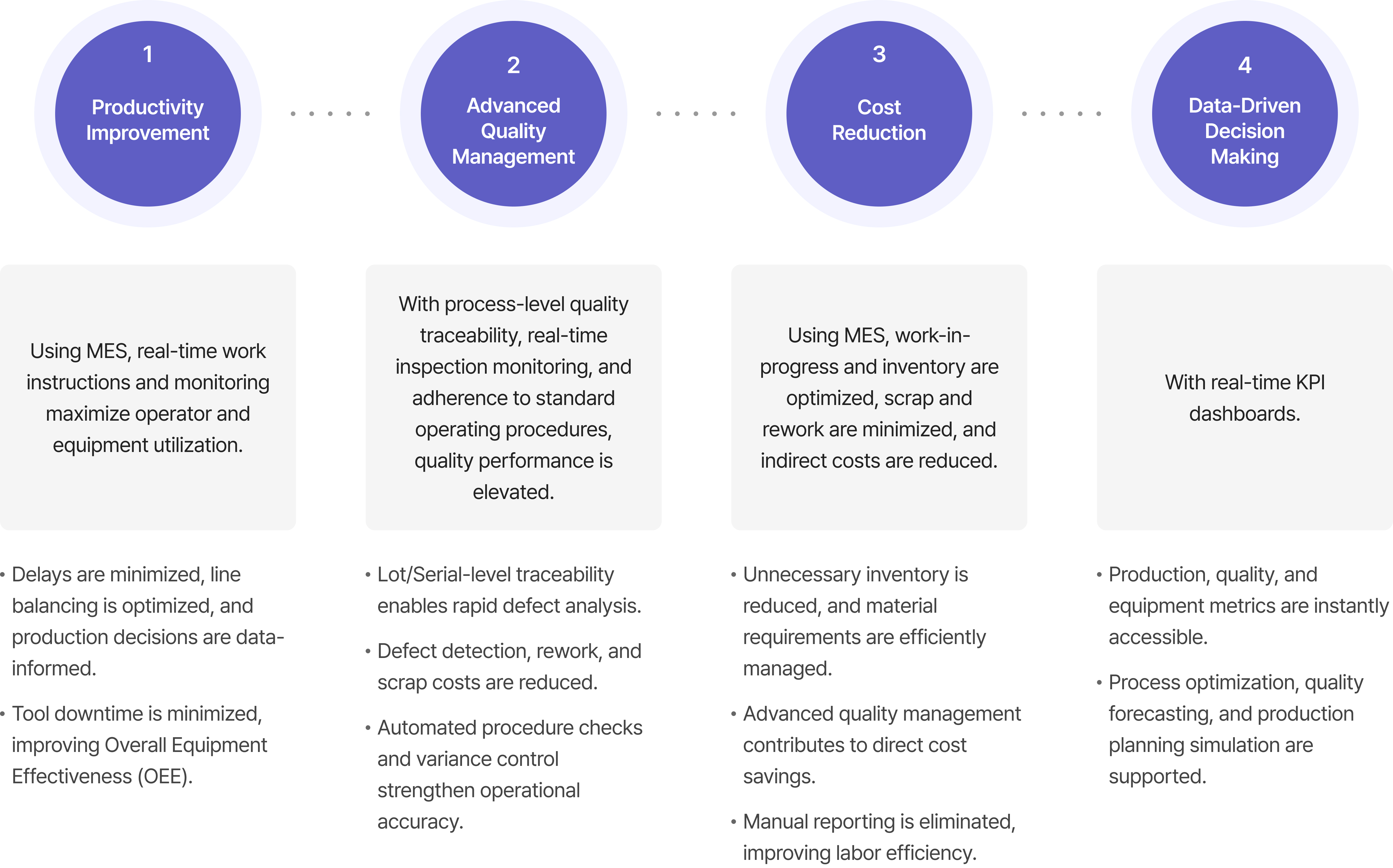 With MES, visibility, traceability, and standardization on the production floor are ensured,