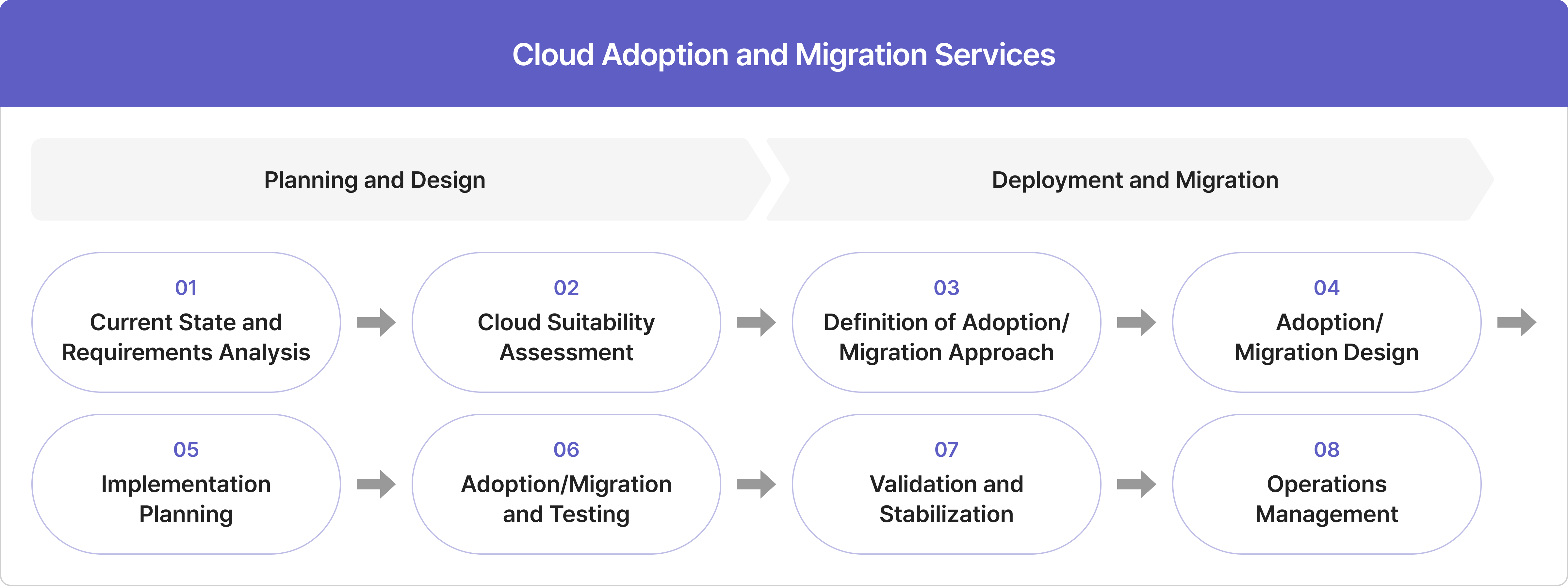 We provide cloud adoption and migration services through a structured, step-by-step approach from planning and design to deployment, migration, and operations, tailored to your specific cloud needs.