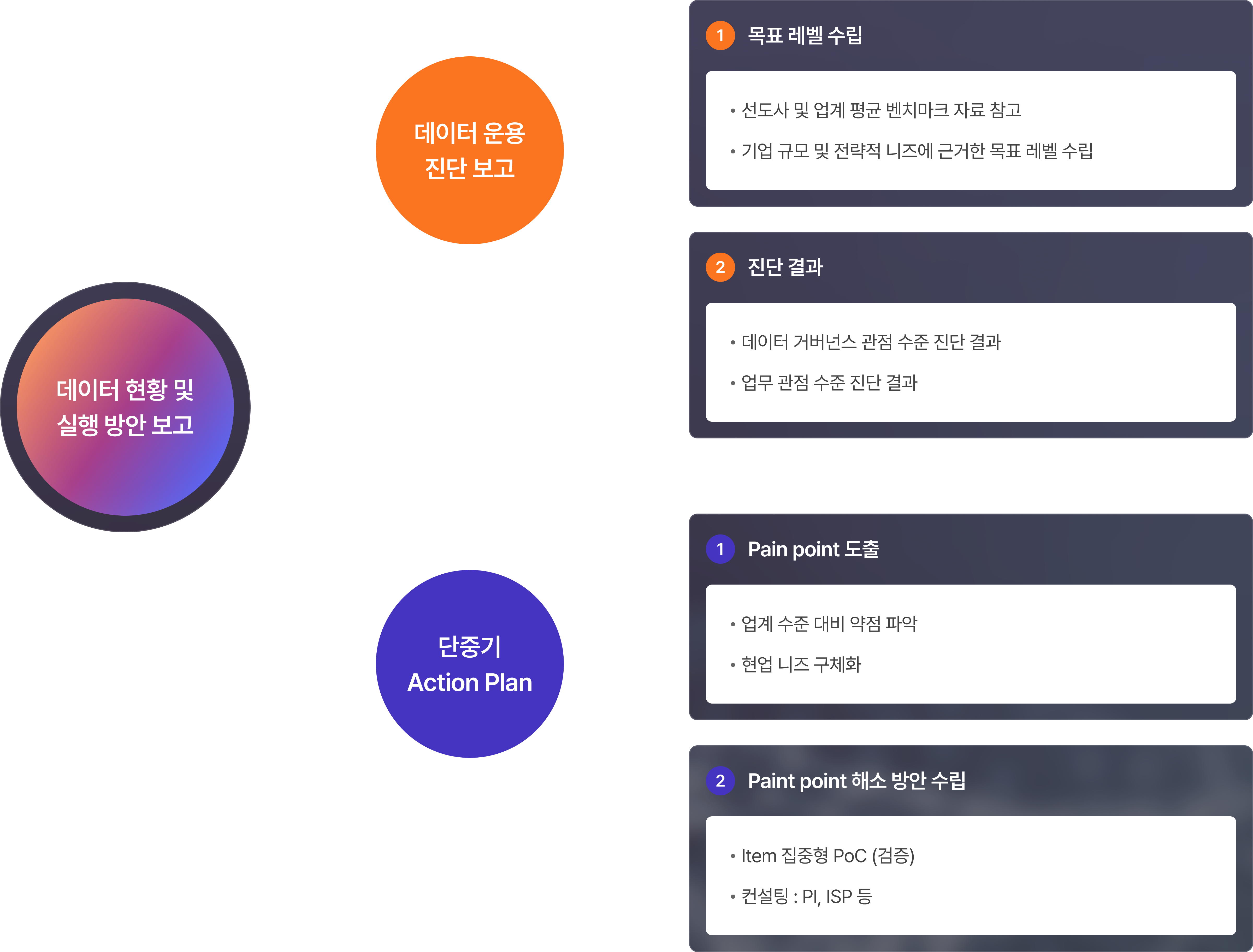 Data를 활용하여 Paint point를 해소하며 Data 기반 경영을 촉진하기 위한 진단을 수행합니다.