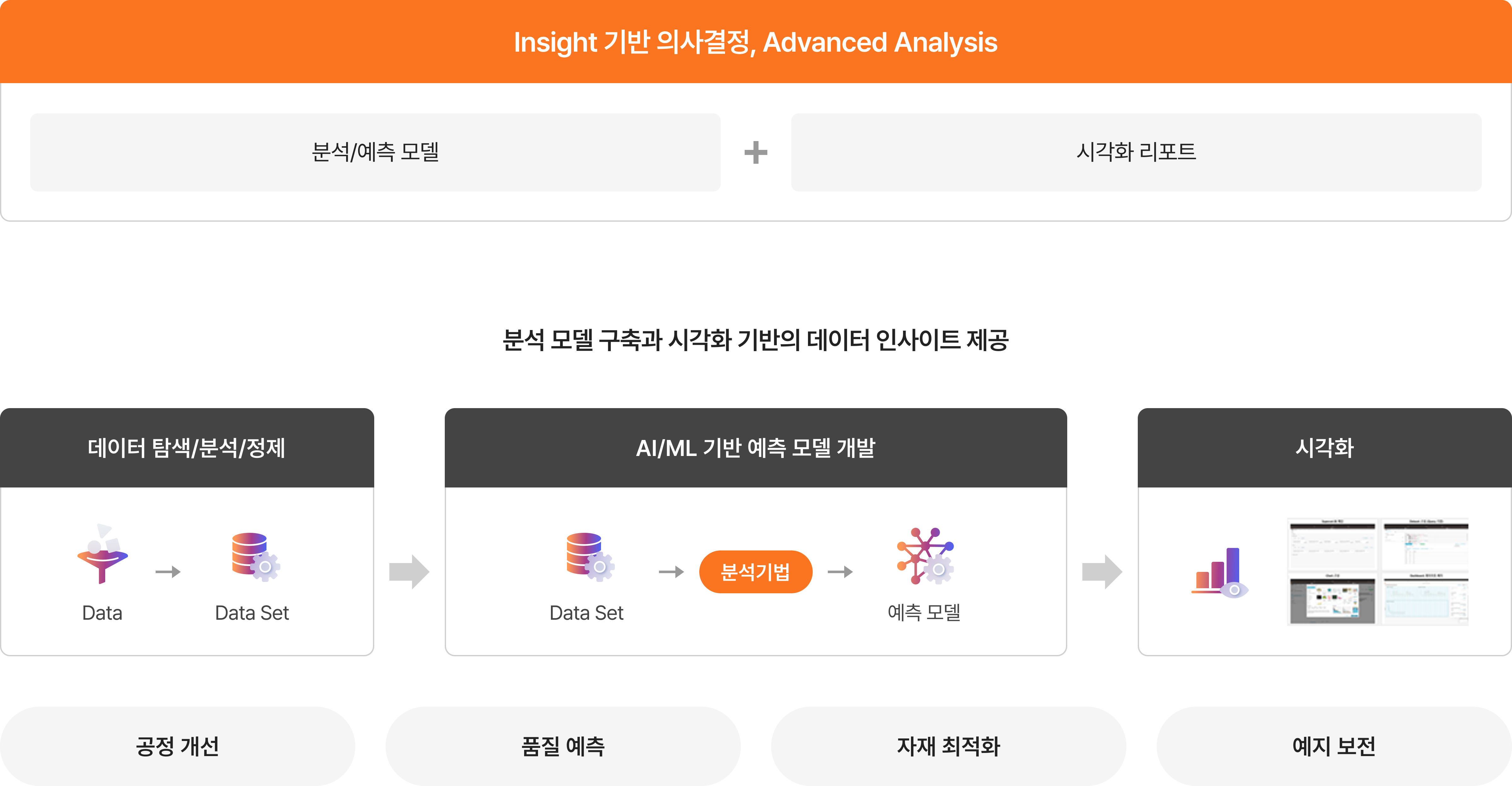 공정 개선, 품질 예측, 자재 최적화 등 전략적 인사이트 도출을 통한 데이터기반 의사결정을 지원합니다. ”