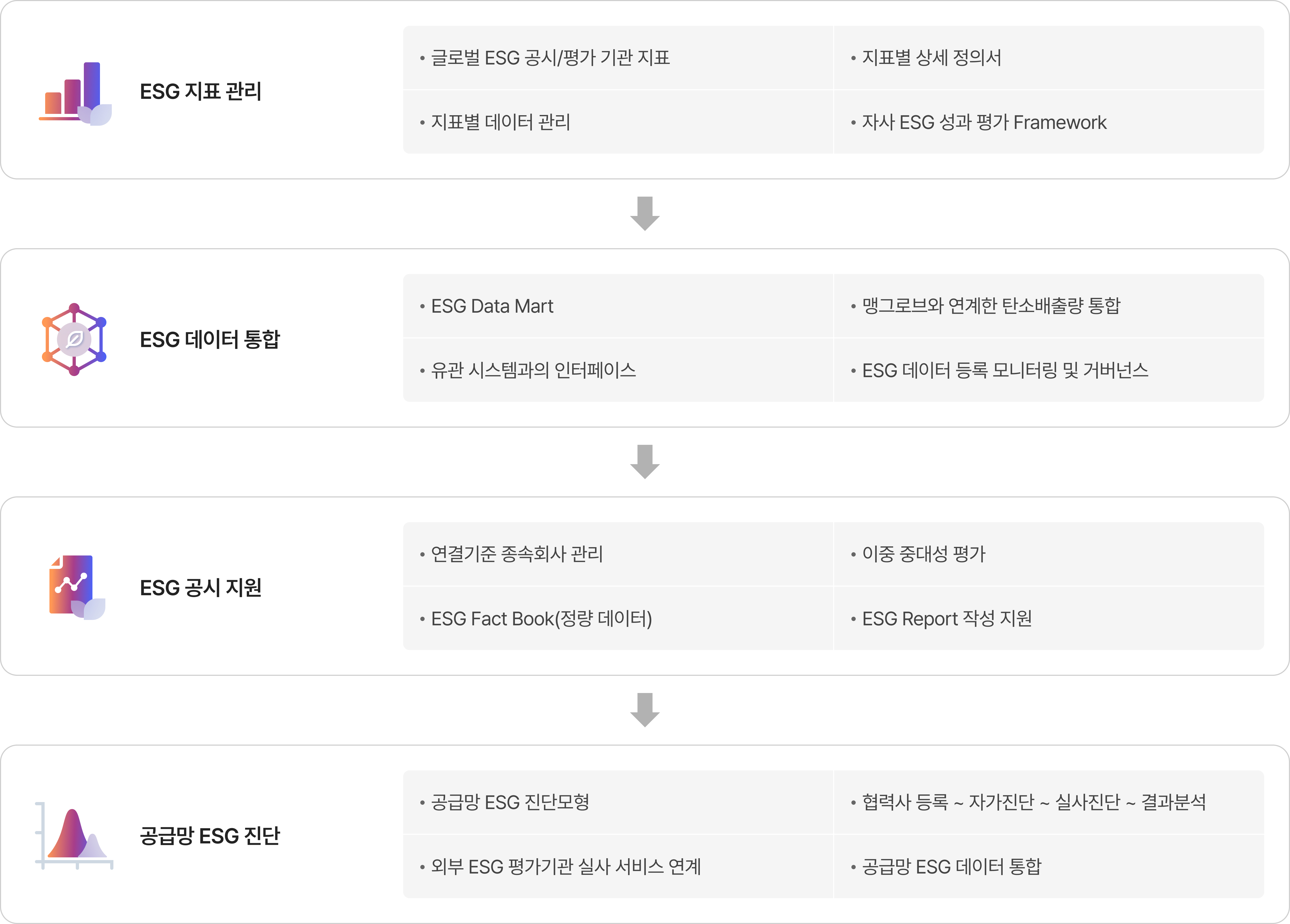 솔루션 운영과 차별화된 부가 서비스를 포함한 통합 ESG 경영 관리 솔루션을 제공합니다. ”