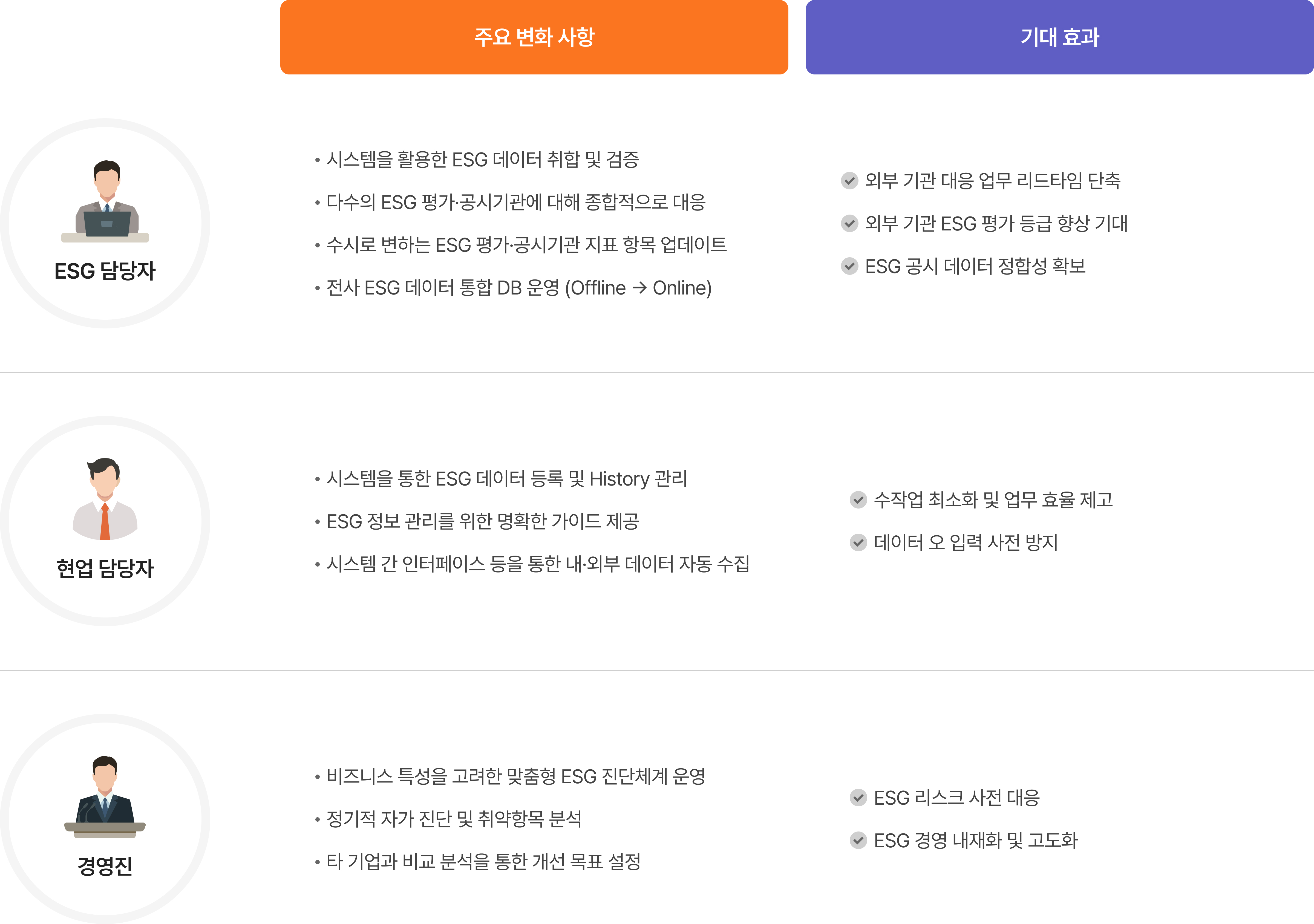 “ ESG 관련 업무 효율화, ESG 데이터의 정합성 확보, 선제적인 ESG 리스크 경감/해소를 기대할 수 있습니다. ”