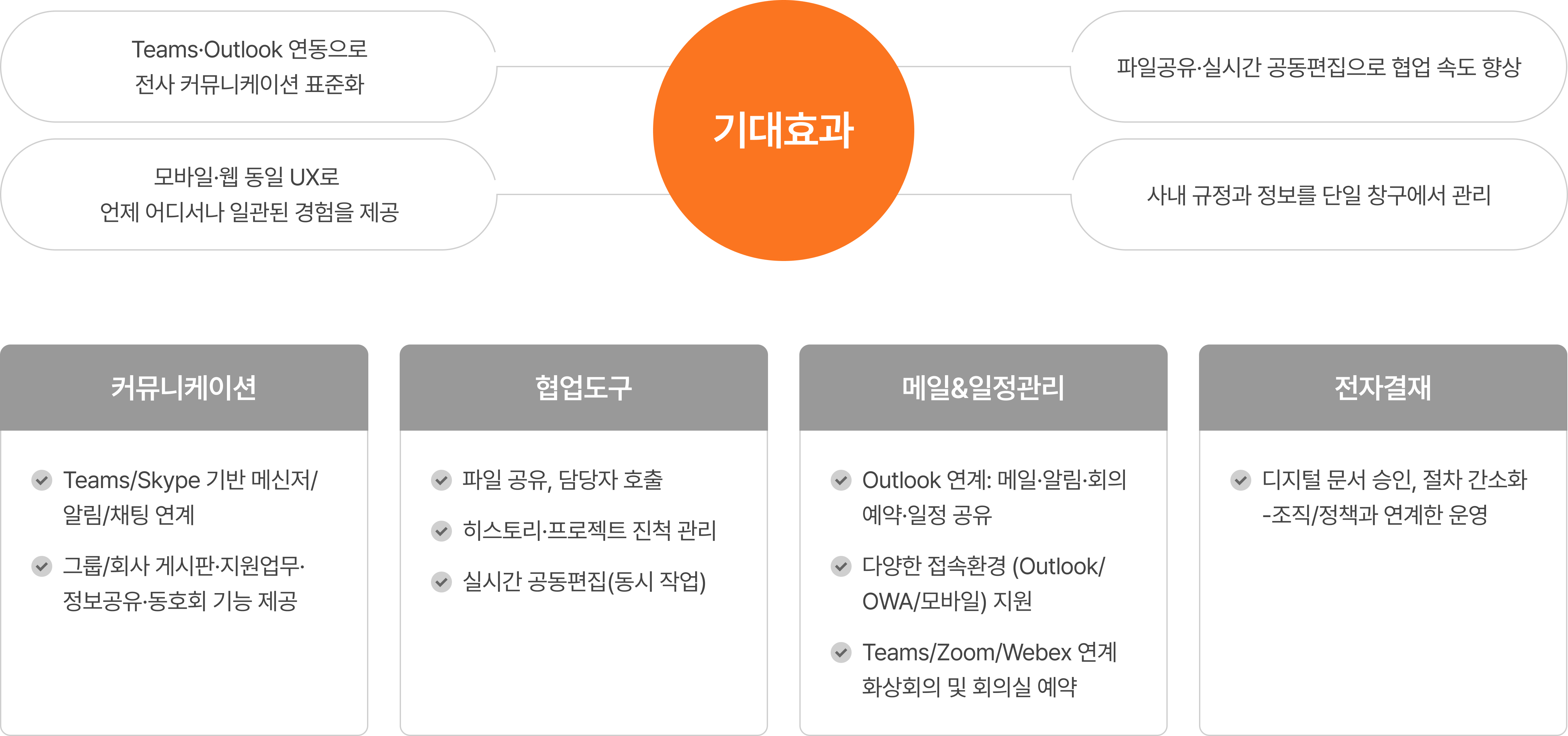 메일∙일정∙전자결재∙게시판 등 기업 업무 환경 및 조직문화에 최적화된 핵심 협업기능을 기반으로