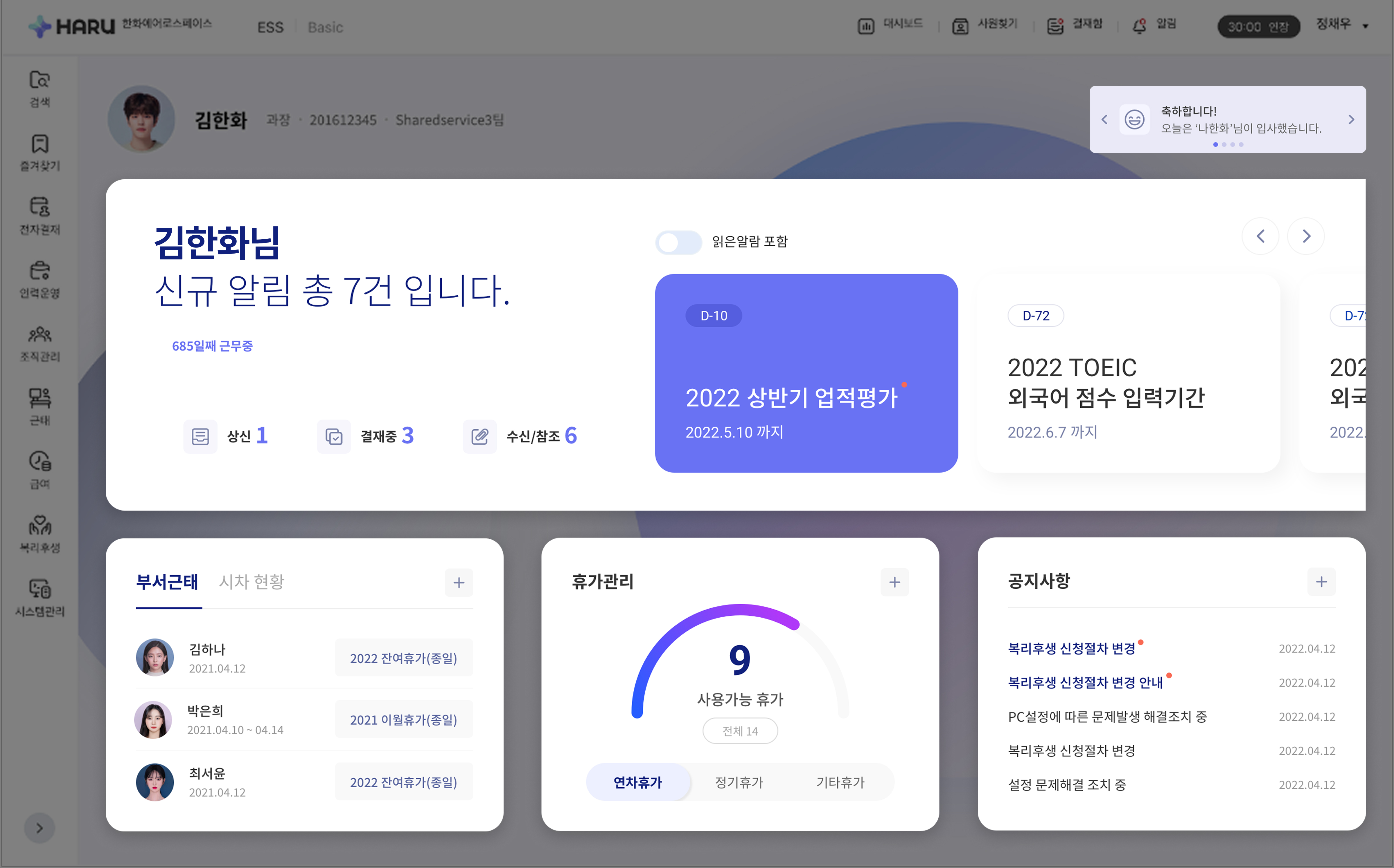 임직원과 인사담당자가 하나의 플랫폼에 로그인하여 각자 다른 권한을 가지고 사용합니다.