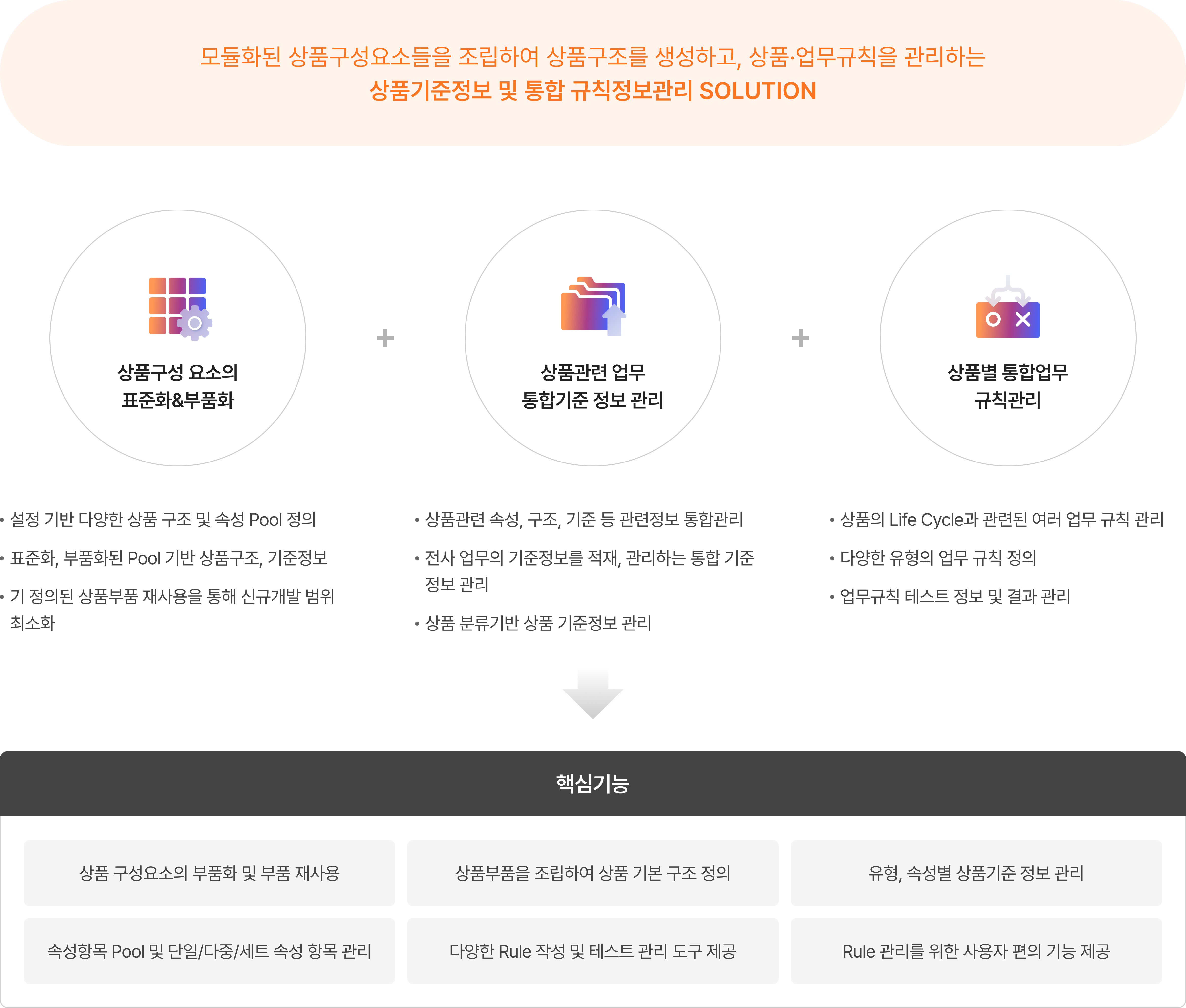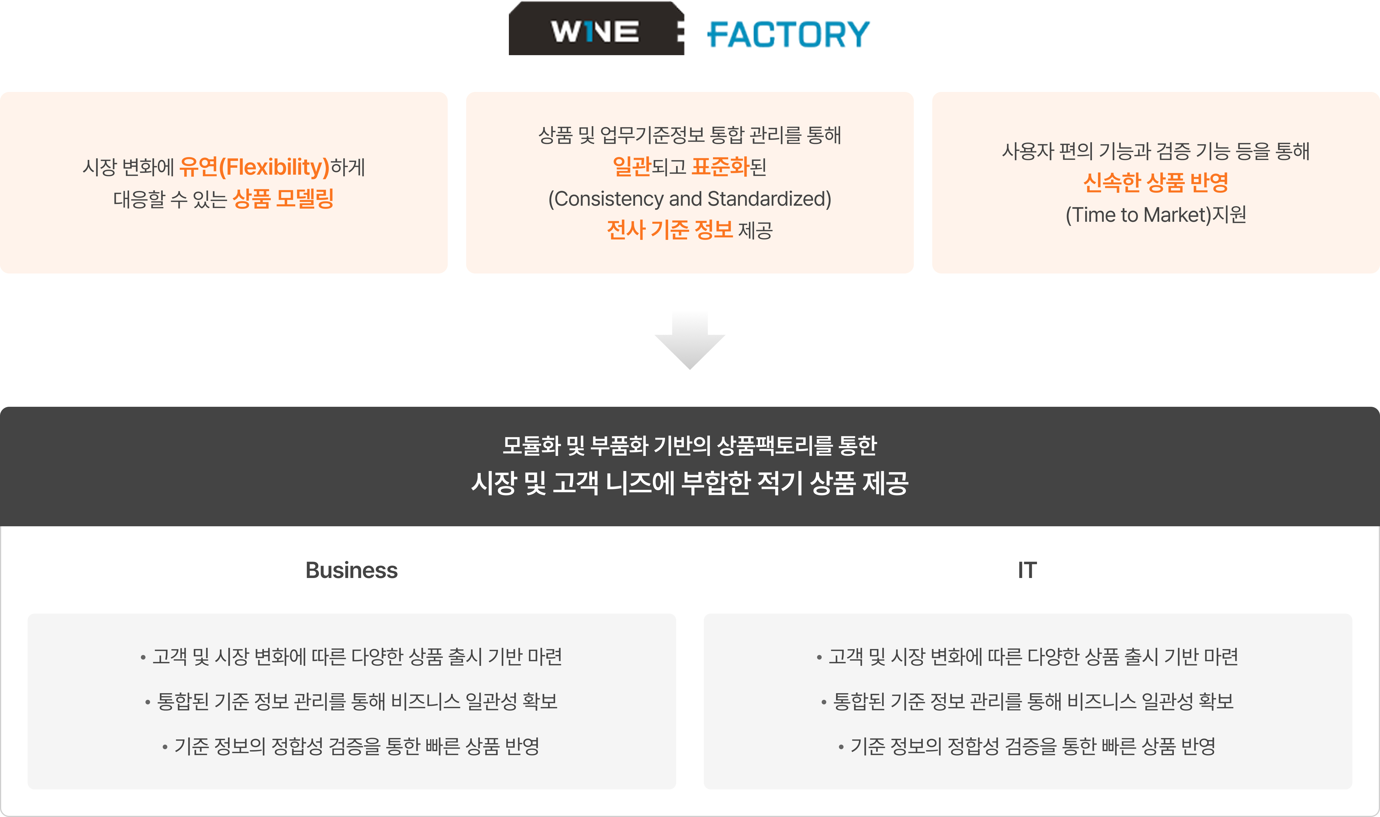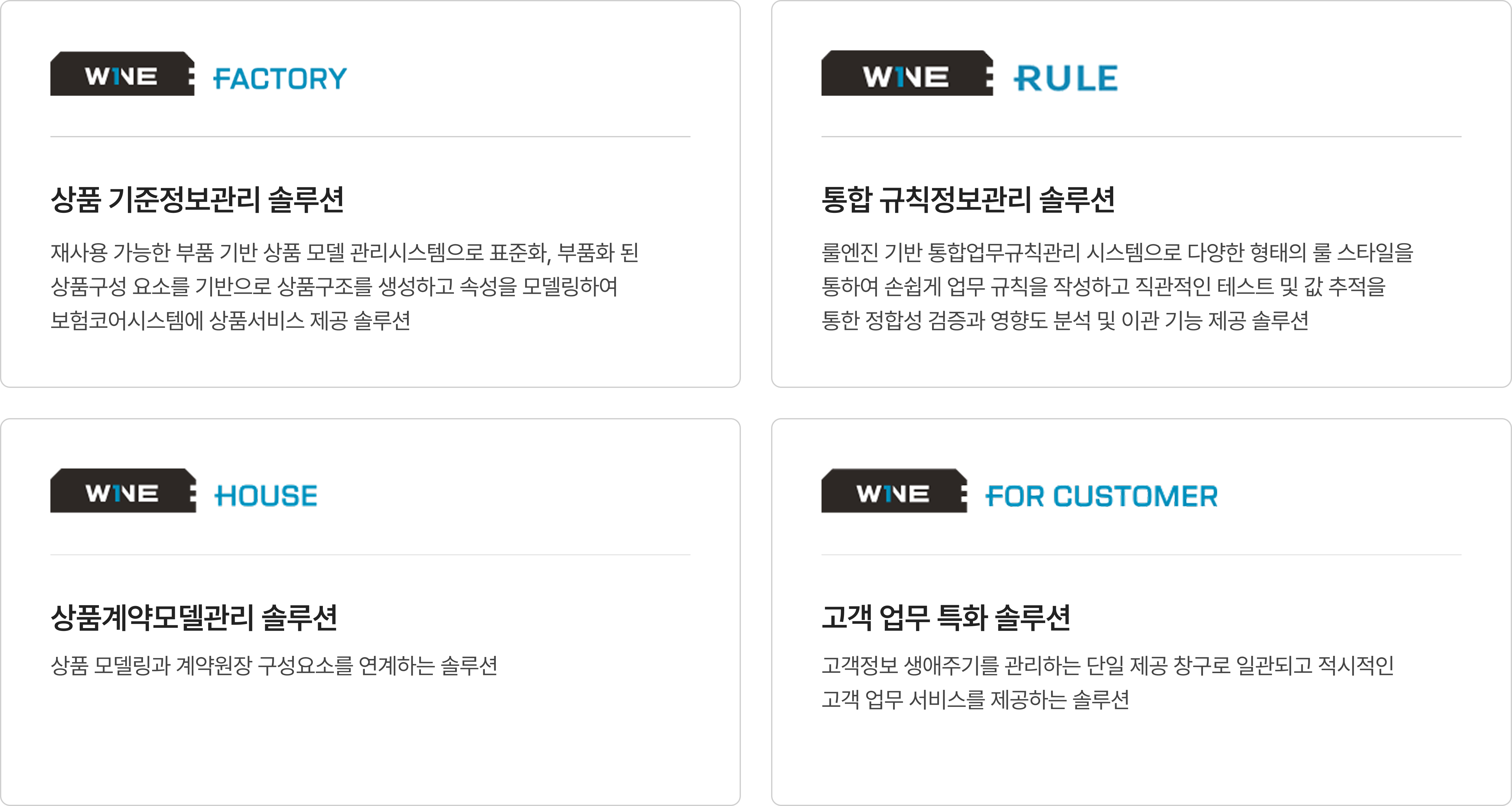 W1NE은 모듈화된 상품구성요소를 기반으로 다양한 상품을 조립하여 상품별/업무별 기준 정보와 업무 규칙을 통합 관리하는 솔루션입니다.