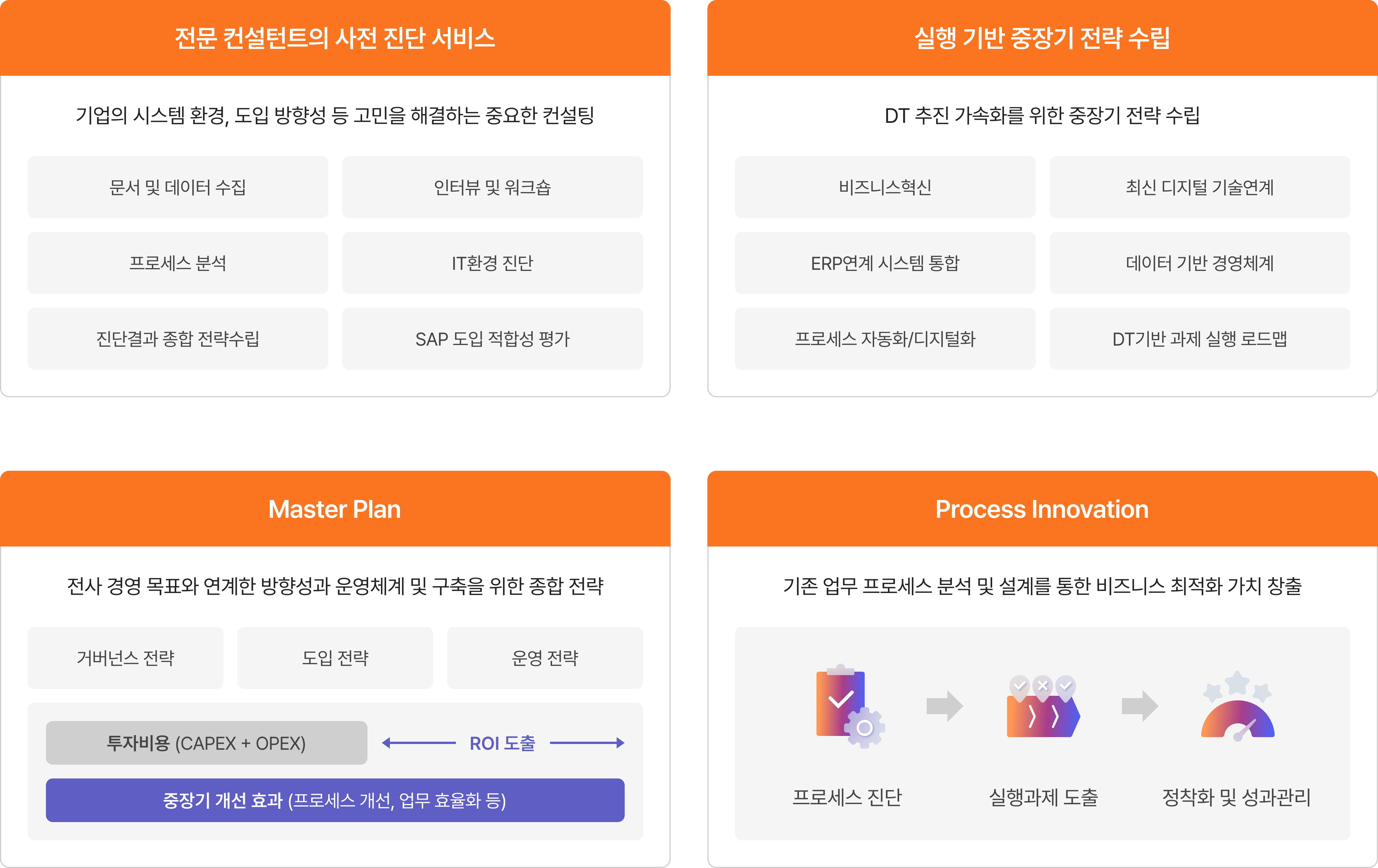 기업의 IT환경과 업무 프로세스를 종합적으로 진단∙ 분석하여 시스템 도입 범위와 실행 로드맵을 수립하고 비즈니스 최적화