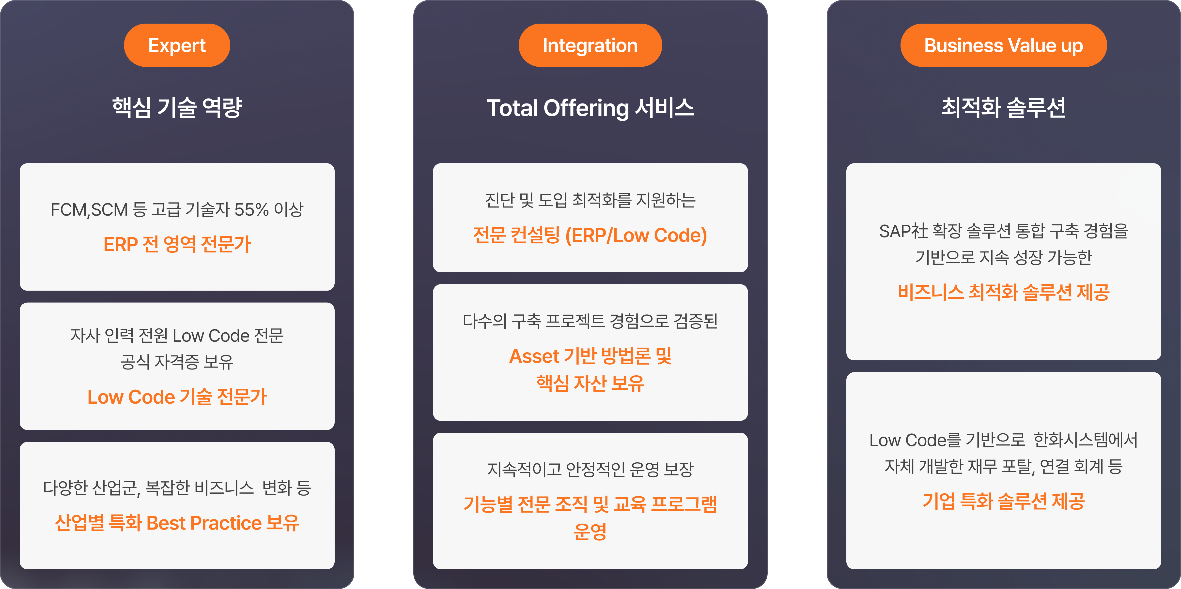 “ 다양한 경험을 보유한 ERP/LCAP 전문 인력의 최적화된 컨설팅으로 기업에 특화된 솔루션을 제공합니다. ”